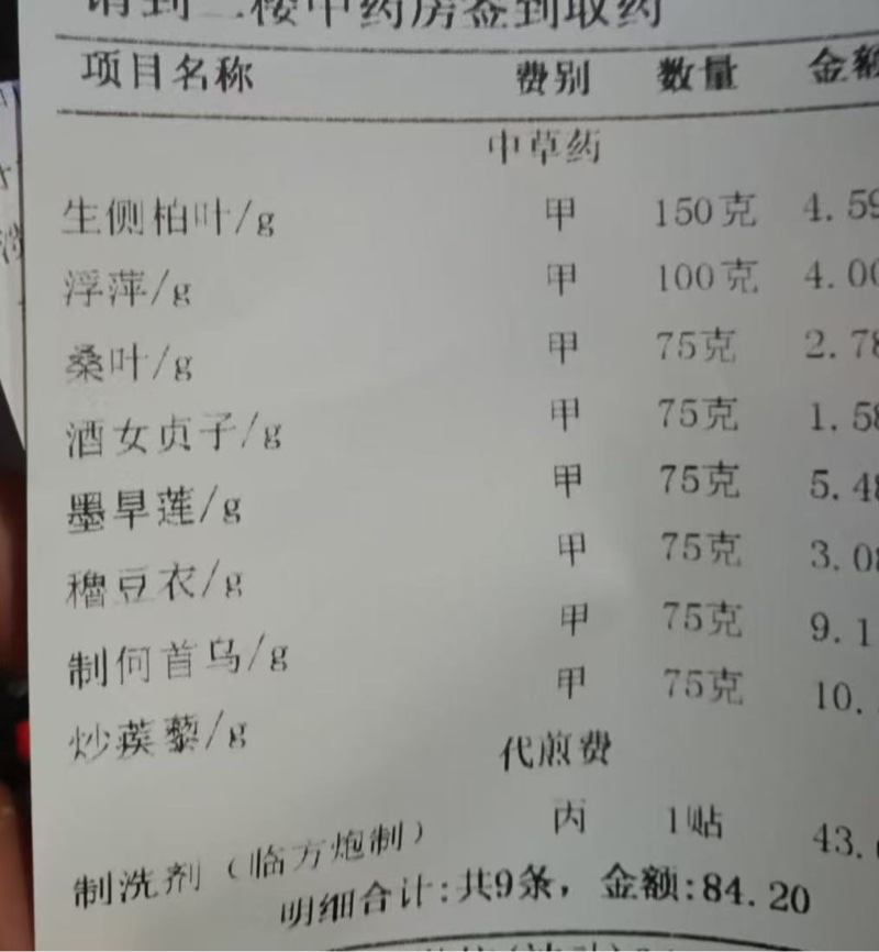 23年5月新冠后头发狂掉,头顶基本秃没了。之后去本地中医院看了2年脱发专科,用了2年米诺头顶终于恢复过来了。非那雄胺因为之前在备孕医生没给配,所以基本就是米诺中医院自制的洗发露。这是洗发露。两年来的情