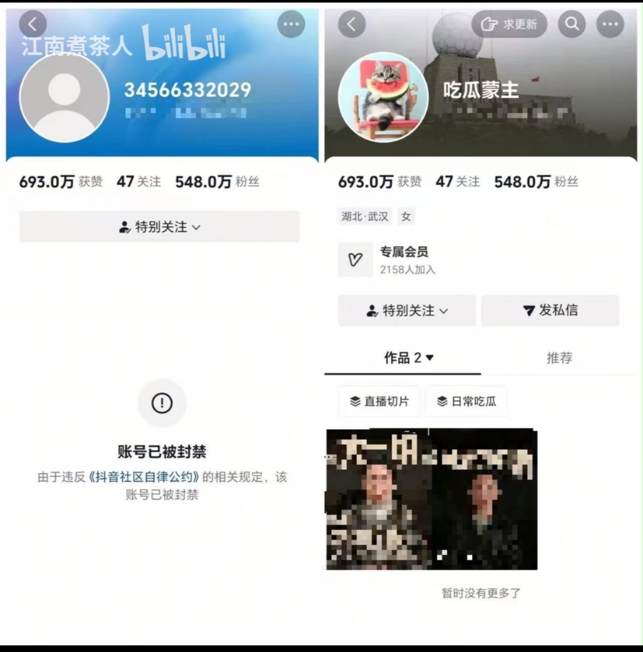全平台封禁,抖音还能查看账号隔壁等平台 ,其原账号已经消失