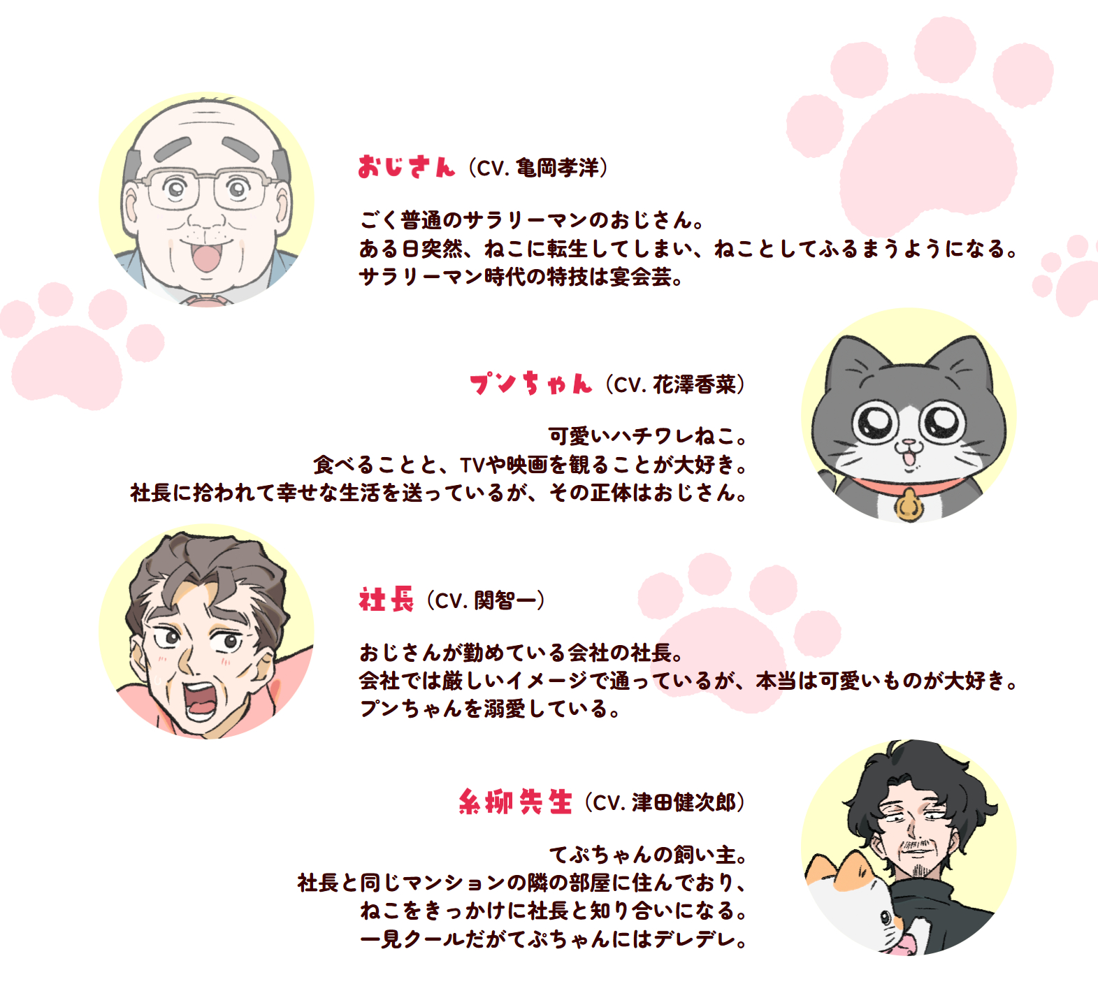 电视动画《转生成猫的大叔》公开主视觉图,并公布主要角色声优:亀岡孝洋、花澤香菜、関智一、津田健次郎。该作将在 10 月于富士电视台“ぽかぽか”栏目内播出!【STORY】被一辆卡车撞后,发现自己转生成为