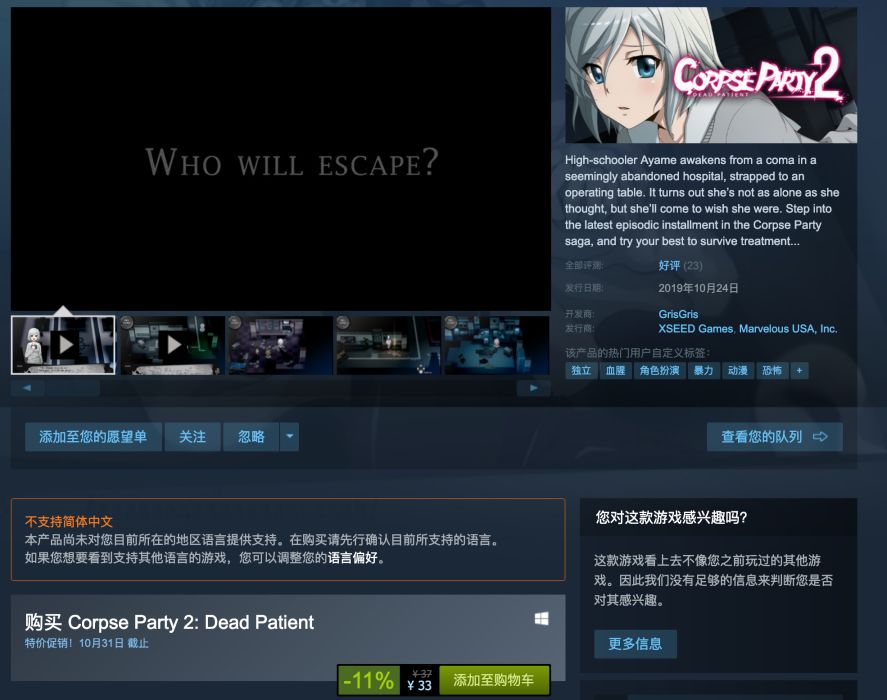 文丨warO 审核丨复读姬 排版丨劫月本文首发于公众号情报姬未经授权禁止任何形式的转载~今天,《尸体派对2:死亡病患》(Corpse Party:Dead Patient)正式登陆STEAM,目前售价