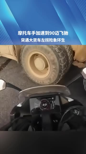 摩托车手加速到90迈飞驰,突遇大货车左拐险象环生。提醒:危险行为 请勿模仿