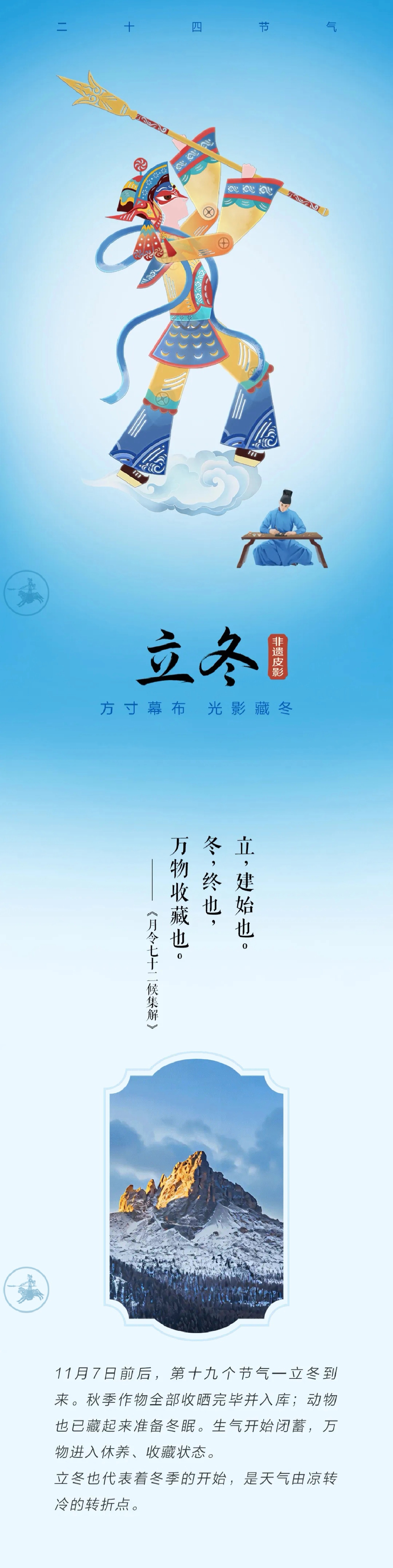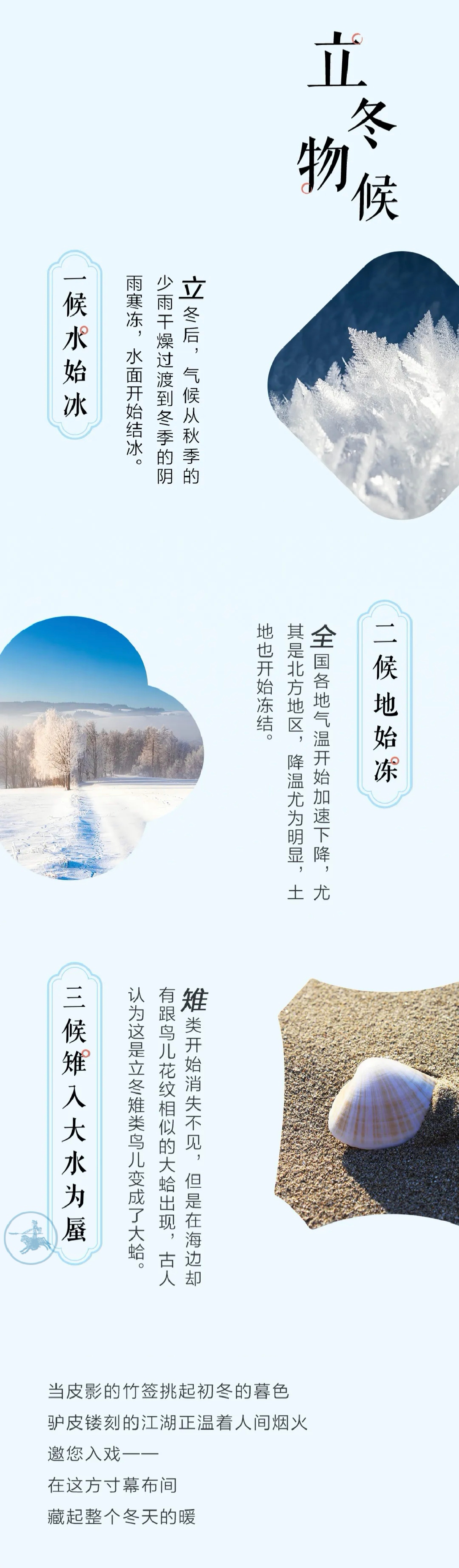 立冬是古代的“四时八节”之一,与立春、立夏、立秋合称“四立”。由于地表尚有“积热”,所以初冬通常不会很冷。在南方地区,从立冬至小雪期间,常会出现风和日丽、温暖舒适的“小阳春”天气。立冬有三候,一候水始