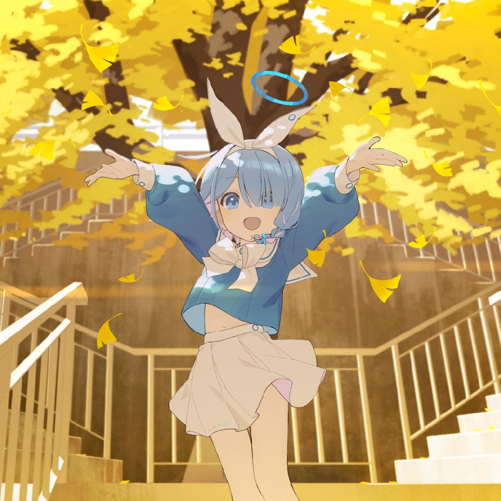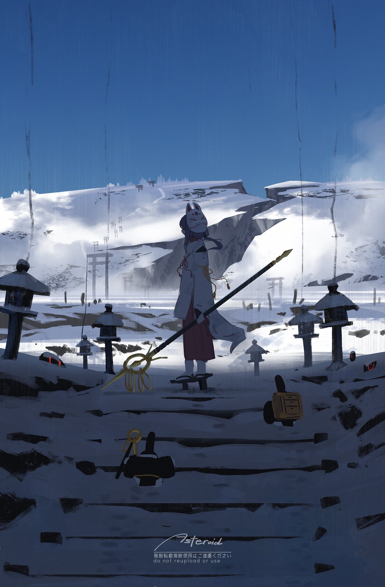 天空被冰冷的水汽晕染成了深沉的湛蓝,几道细长的笔触——就像正在坠落的雨夹雪,如珠帘般垂下,切割着清冷的空气。少女手中的金色长杖向一侧斜斜指出,杖尖锐利,仿佛随时能划破眼前的寂静。那是一个守备的姿态,也