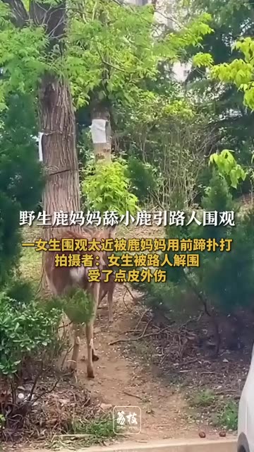野生鹿妈妈舔小鹿引路人围观 一女生围观太近被鹿妈妈用前蹄扑打 拍摄者:女生被路人解围 受了点皮...