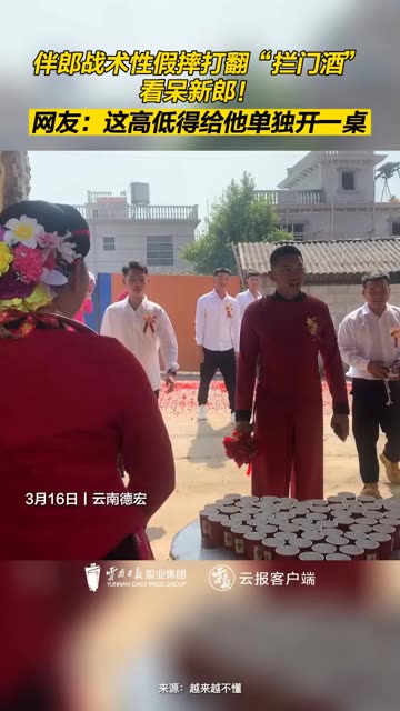 3月16日,云南德宏。新郎被满满一桌“拦门酒”难住,伴郎战术性“假摔”轻松化解。网友:这高低得...