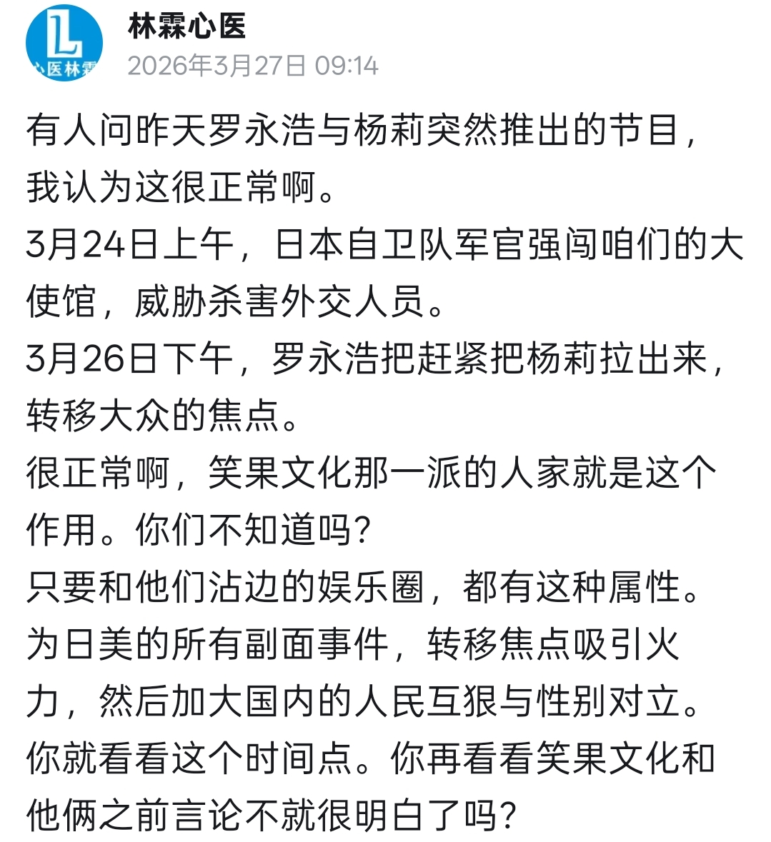 林霖:罗笠对话是为消除倭奴袭击中国大使馆的热度