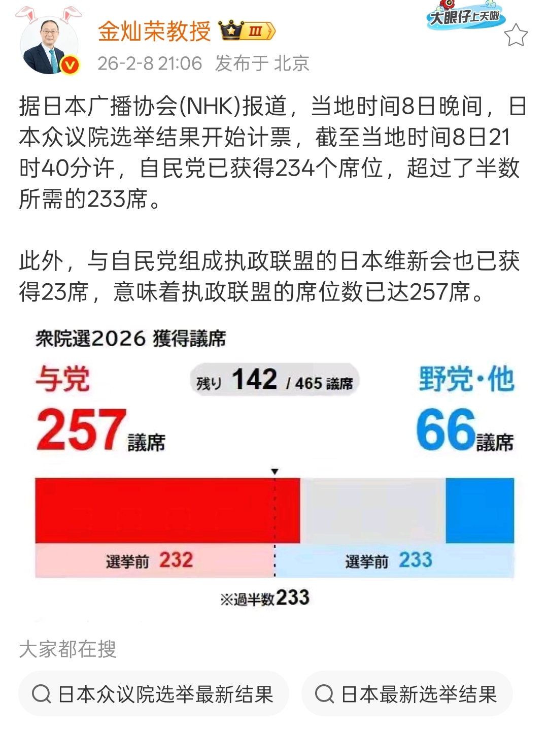 倭奴执政联盟已获议会席位过半数