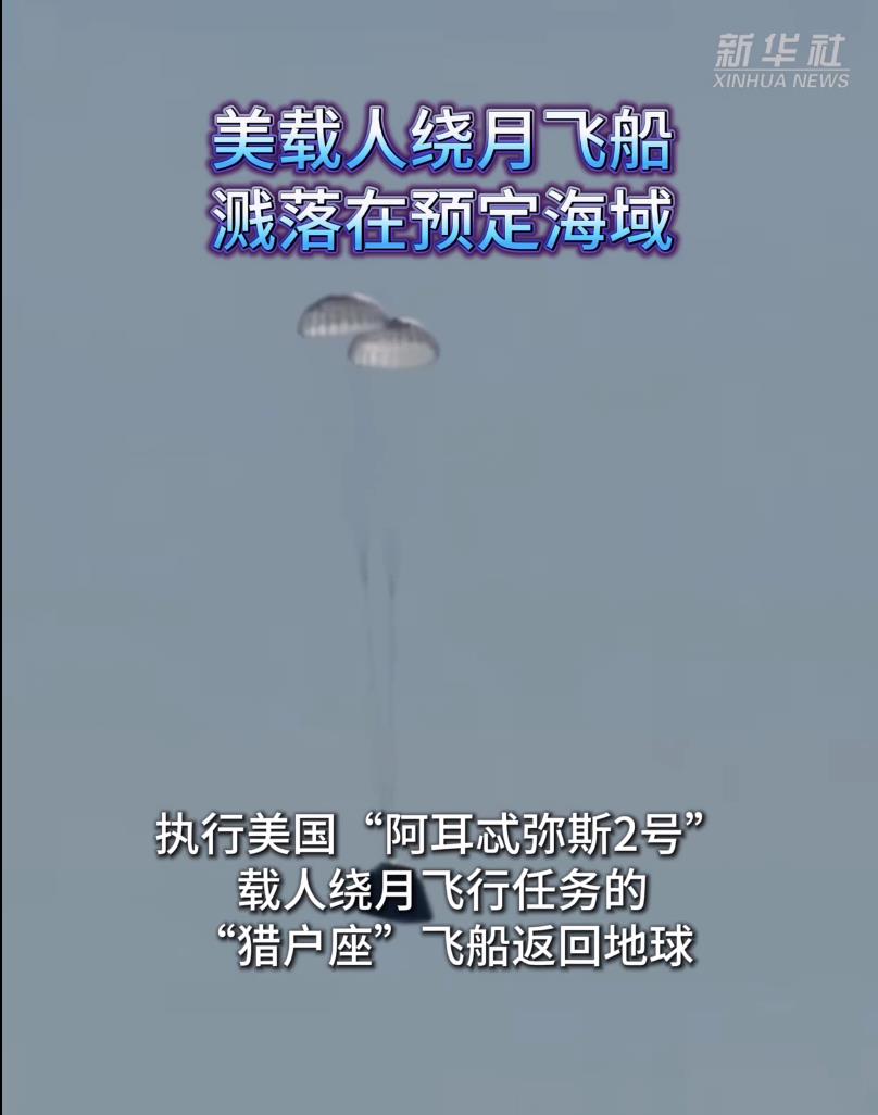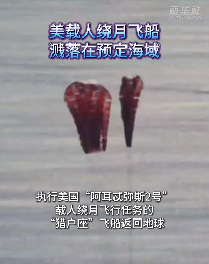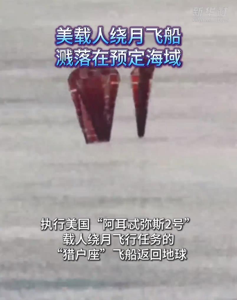 新华社洛杉矶4月10日电(记者高山)执行美国“阿耳忒弥斯2号”载人绕月飞行任务的“猎户座”飞船返回地球,于美东时间10日20时07分(北京时间4月11日8时07分)溅落在加利福尼亚州圣迭戈附近海域。美