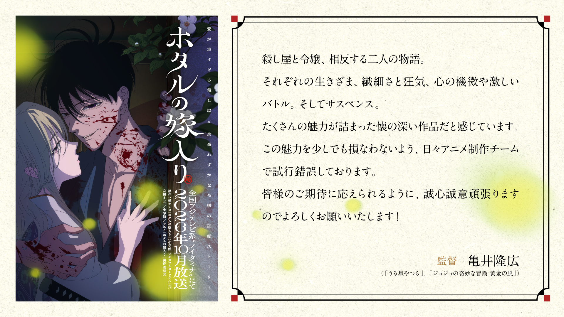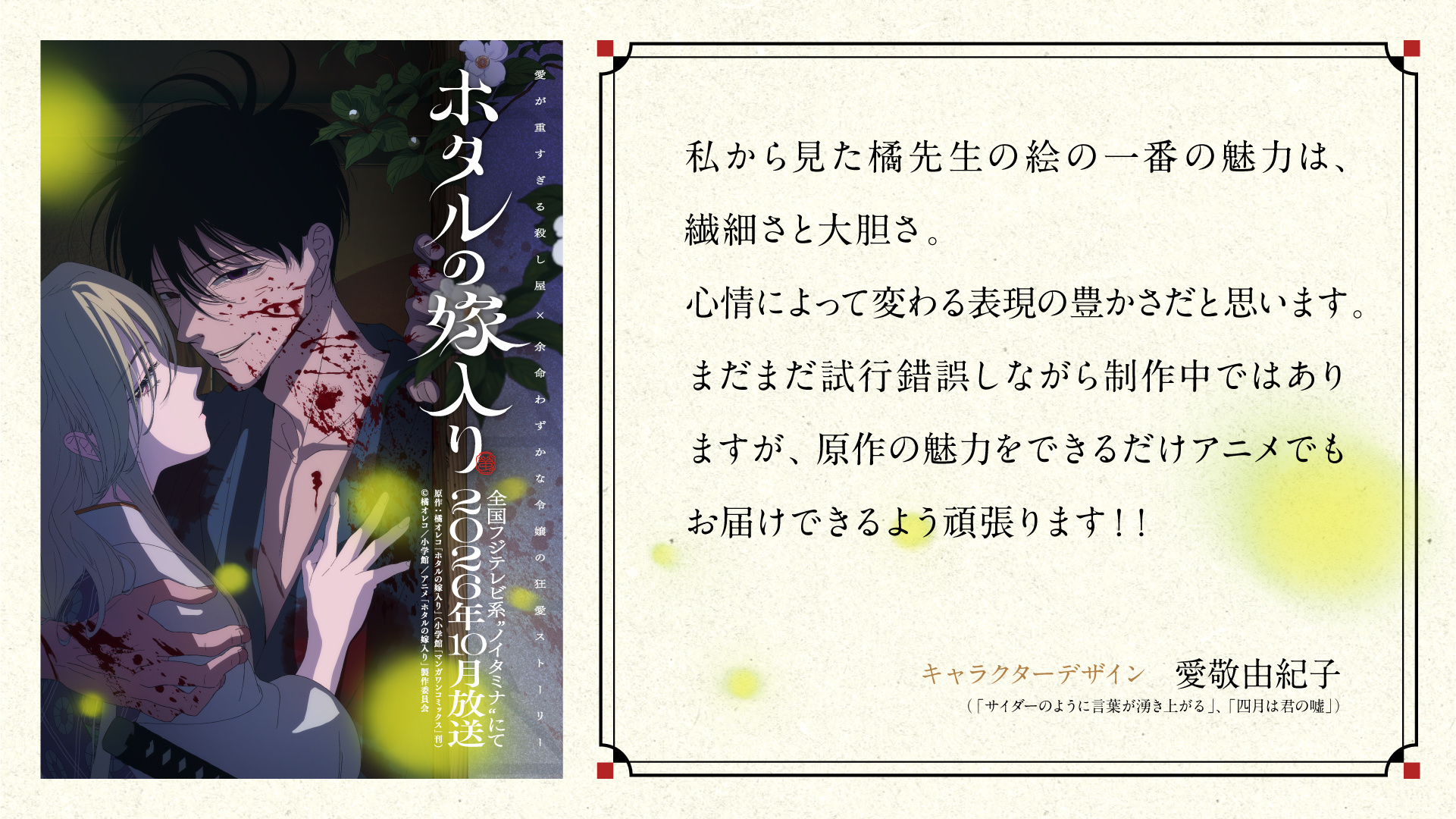 橘オレコ原作漫画《萤火虫的出嫁》宣布改编为电视动画,并公开先导视觉图、主要制作人员,该作将在 10 月开播!■ 该作由 david production 负责制作,代表作:《炎炎消防队》《新版福星小子
