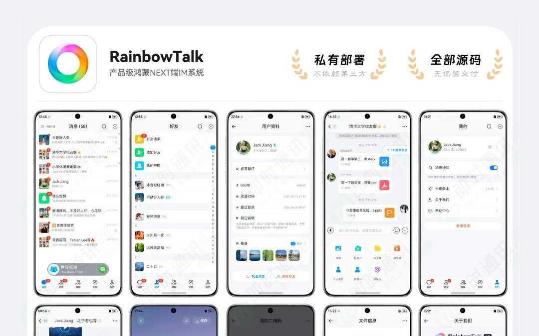 1、基本介绍RainbowTalk 是一套基于 MobileIMSDK 开源通信框架的产品级纯血鸿蒙NEXT端IM系统。RainbowTalk与姊妹产品 RainbowChat技术同源 ,不同于市面上