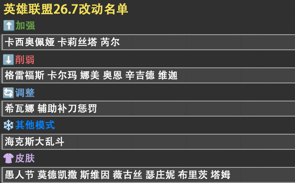 LOL26.7前瞻 卡西奥佩娅…卡莉丝塔加强 格雷福斯…卡尔玛削弱 希瓦娜调整