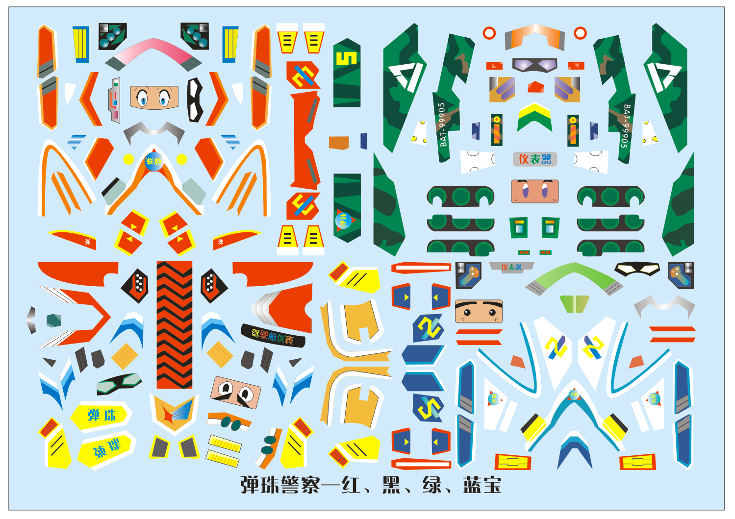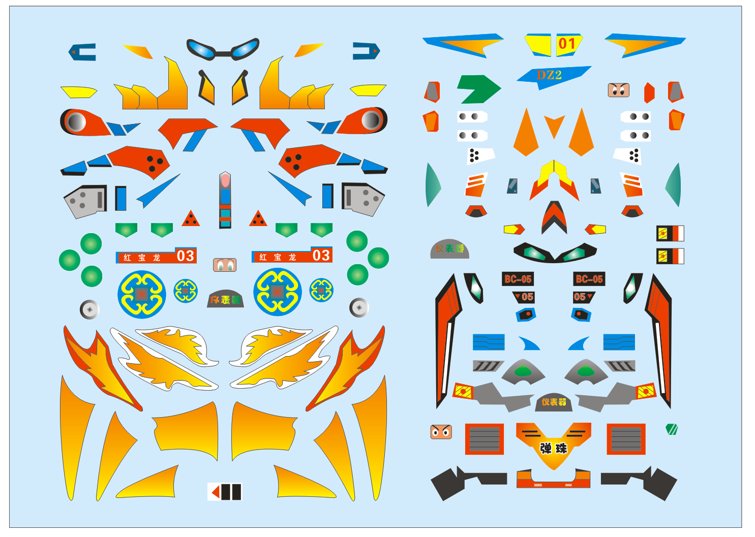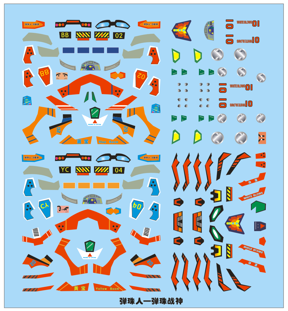 完成了弹珠光明龙和弹珠JC初代机体的简化贴纸图,我连坐骑的地方都懒得画,只画了机身外露的,现在还剩下魔鬼三枪手、四圣兽、神剑侠和一些其他的,应该这一个星期内可以弄完,把弹珠系列的贴纸弄完之后,应该会弄