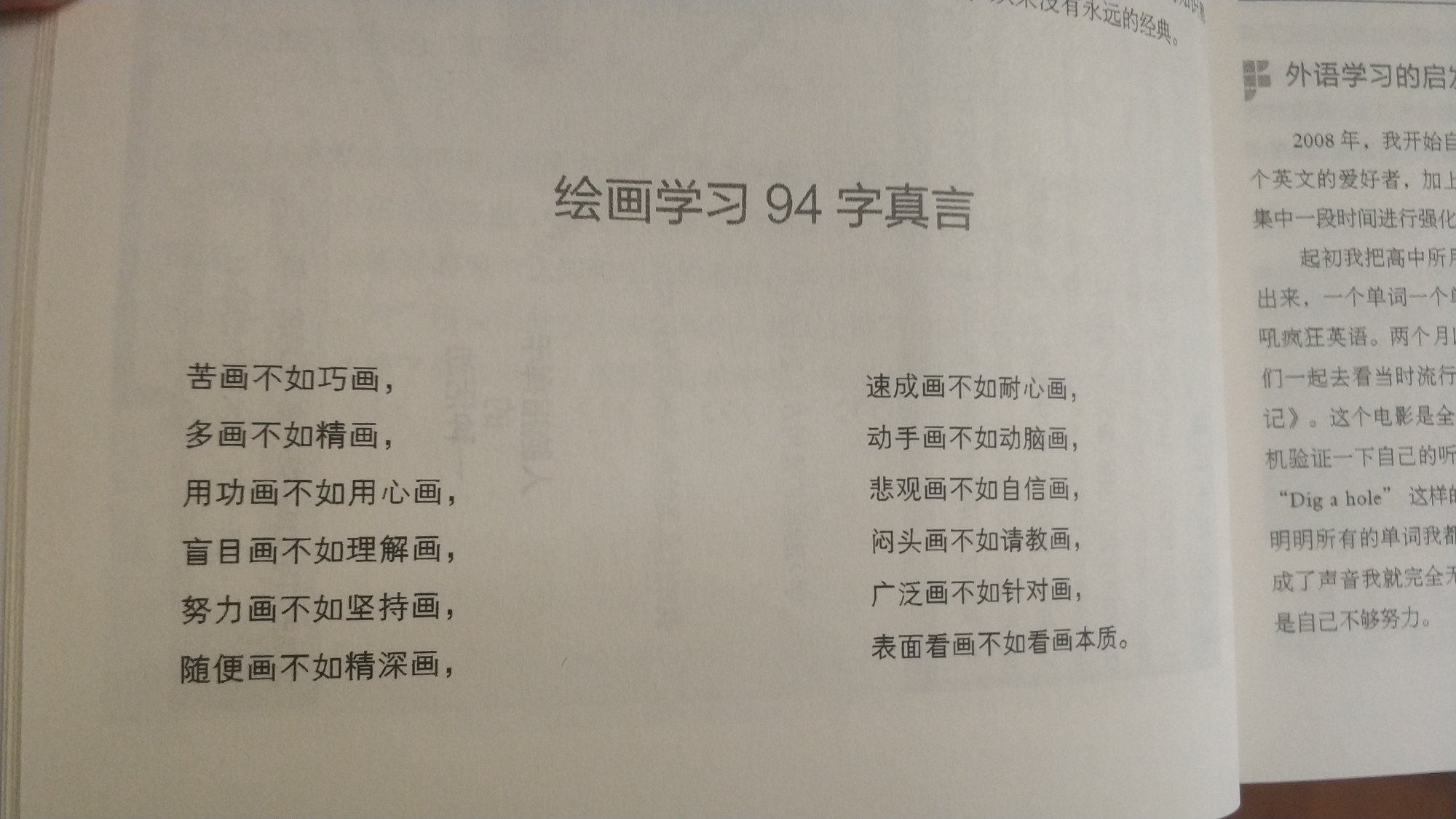 我算是终于把这书给看完了,将近330页,纯文字向内容。比起一般都绘画技巧书来讲,这本书更多的是要告诉你学习的方法,纠正和引导下思想观念的内容。为此作者还引用了大量这个人体生理学,神经学,进行科学解释。