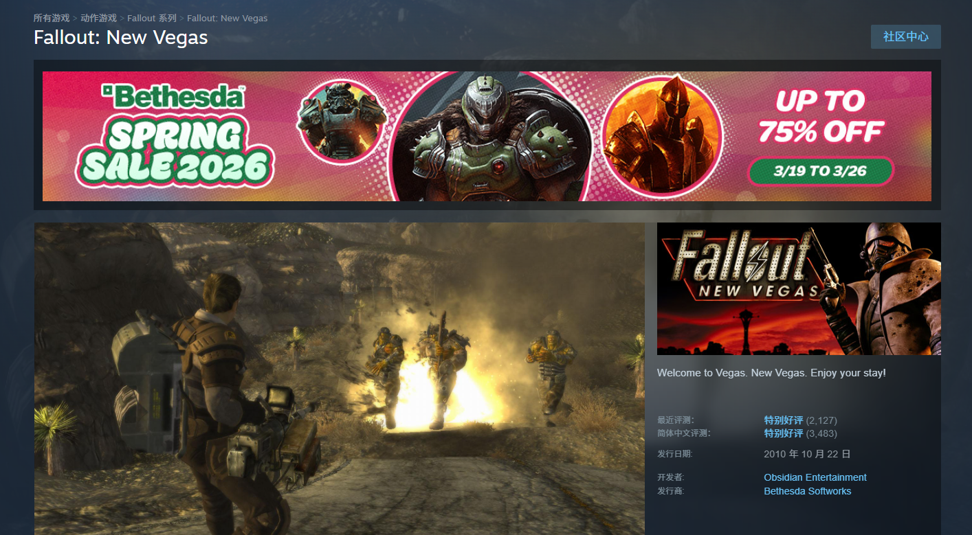 被誉为史上最佳RPG之一的《辐射:新维加斯》现已在Steam平台迎来新史低折扣。游戏原价约68元,当前-90%后仅售4.1元,创下该作在Steam有史以来的最低价格。本次促销为Steam春季特卖活动的