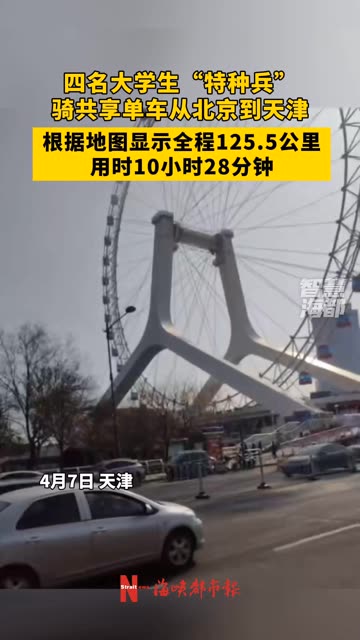 26次播放 | 00:10四名大学生“特种兵”骑共享单车从北京到天津,根据地图显示全程125.5公里 ,用时10小时28...