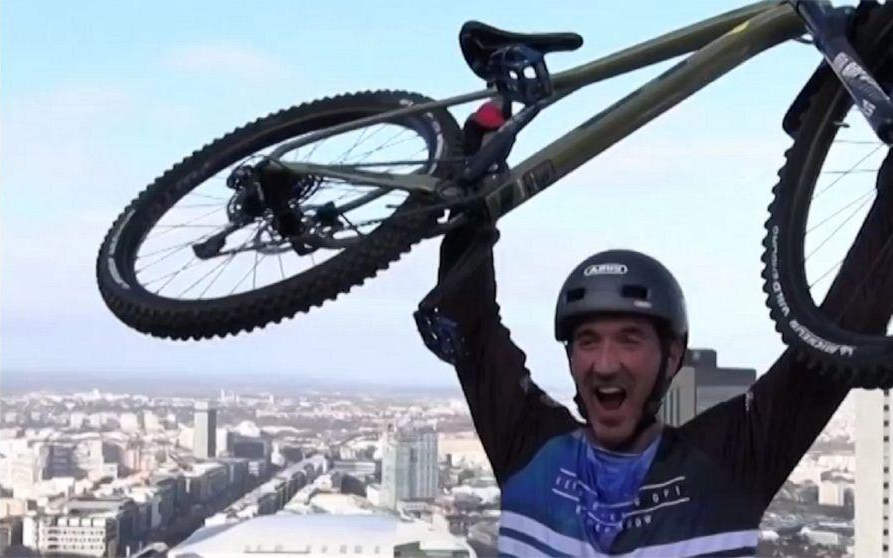 法国自行车运动员骑自行车上144米大厦,全程脚未落地,仅耗时30分钟