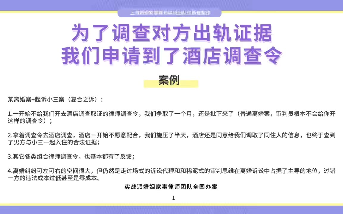 上海离婚律师梁聪律师团队原创:为了调查对方出轨证据,我们申请到了酒店调查令