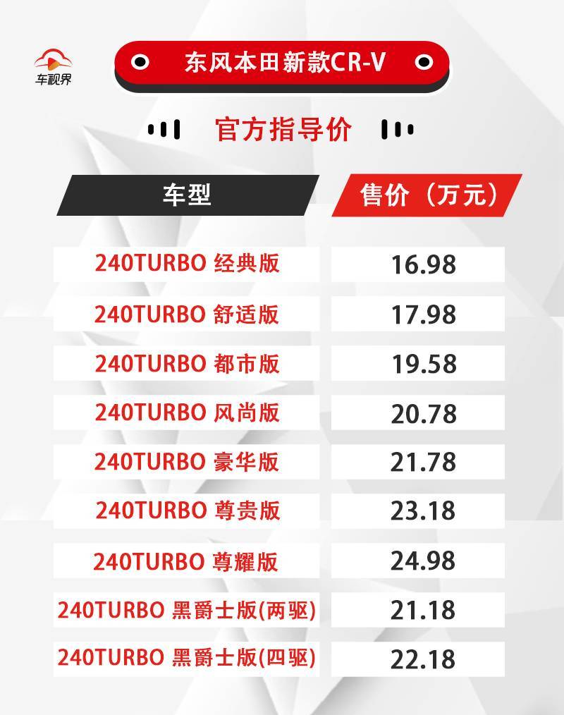 北京时间7月10日晚,新款东风本田CR-V正式上市,新车共推出17款车型,售价区间为16.98-27.68万元。 一下就推出了燃油版和混动版共17款车型,想必大家看到这么多选择一定是懵圈的吧!今天,我