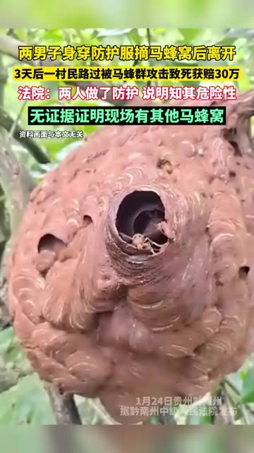 0次播放 | 00:11两男子身穿防护服摘马蜂窝后离开,3天后一村民路过被马蜂群攻击致死获赔30万