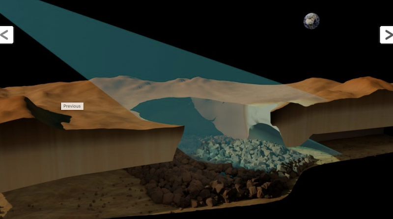 放大查看。艺术家绘制的示意图,展示了金星表面熔岩管顶部的天窗 —— 即熔岩管顶部的一个孔洞,可通往其下方的地下熔岩管结构。图片来自 RSLab 特伦托大学。熔岩管在地球上很常见,火星和月球上也存在熔岩