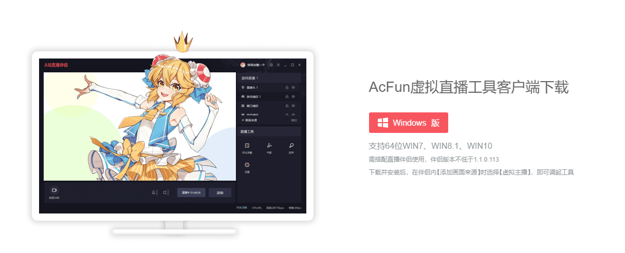 · 工具安装1. 点击首页顶端的“下载客户端”,进入下载页面:拉到底部,下载虚拟直播工具注:目前工具只支持win· 工具使用2. 打开AcFun直播伴侣,选择画面来源-虚拟主播 3. 添加模型:选择想