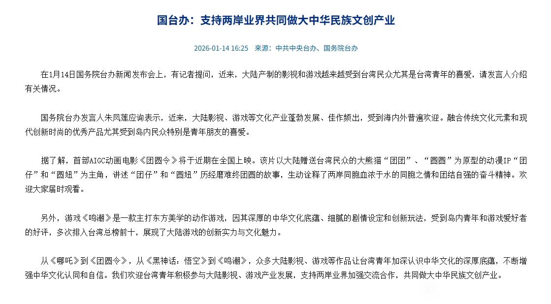 共15张《鸣潮》被国台办点名,与《黑神话》《哪吒》齐名!