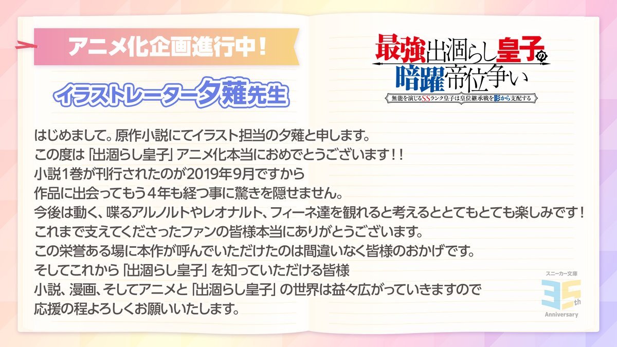 タンバ担任原作,夕薙担任插画的小说《最强出涸皇子的暗跃帝位争夺 虽然对帝位没兴趣,但我不想死所以让我弟当皇帝吧 / 最强废渣皇子暗中活跃于帝位之争 佯装无能的SS级皇子背地支配王位继承战》宣布动画化企