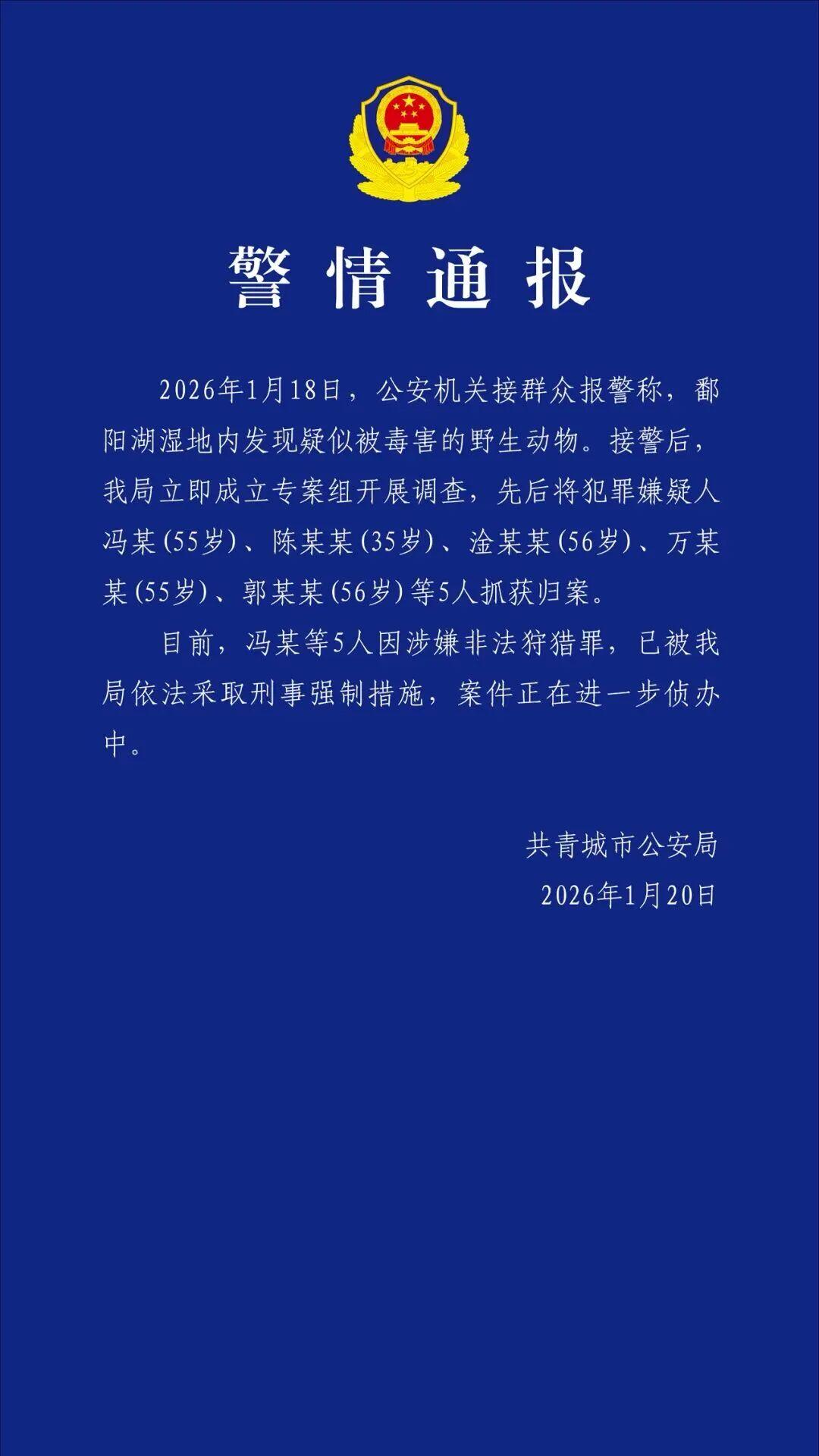 来源:北京日报“共青公安”微信公众号消息,1月20日,江西共青城市公安局发布警情通报:1月18日,公安机关接群众报警称,鄱阳湖湿地内发现疑似被毒害的野生动物。接警后,共青城市公安局立即成立专案组开展调
