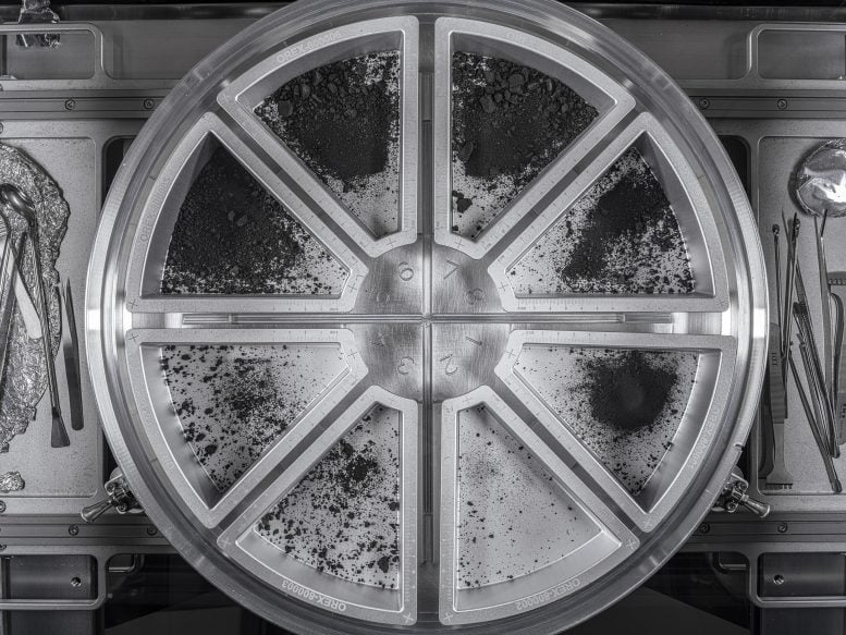 八盘装有贝努小行星最终样本的样品盘视图。这些尘埃和岩石是从接触脱离采样机构(TAGSAM)头部的顶板倒入托盘中的。此次倾倒收集到51.2克样本,使小行星样本的最终质量达到121.6克。图片来源:NAS