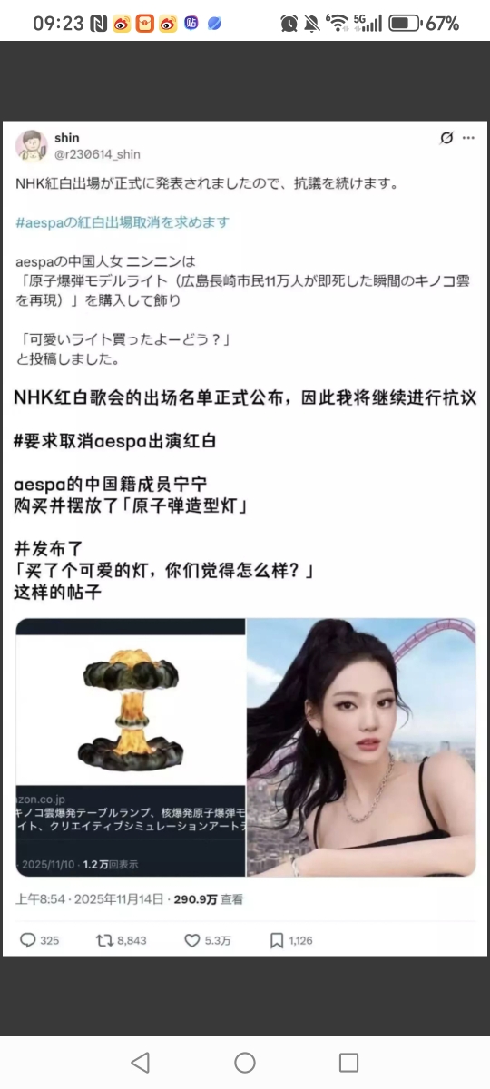 韩国知名女团aespa的中国成员宁艺卓购买原子弹台灯被日本人在推特炎上(将上日本今年红白)