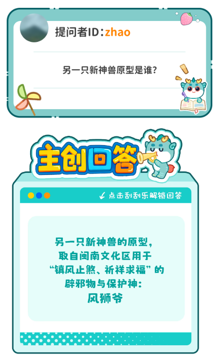 各位寻宝迷们,久等啦~【主创有话说】终于上线!听说大家迫不及待地想知道,另一只新神兽的原型和名字?准备好了吗?答案现在揭晓——TOP1问题风狮爷?!小编火速去补了课,原来是闽南文化区独特的民俗符号,闽