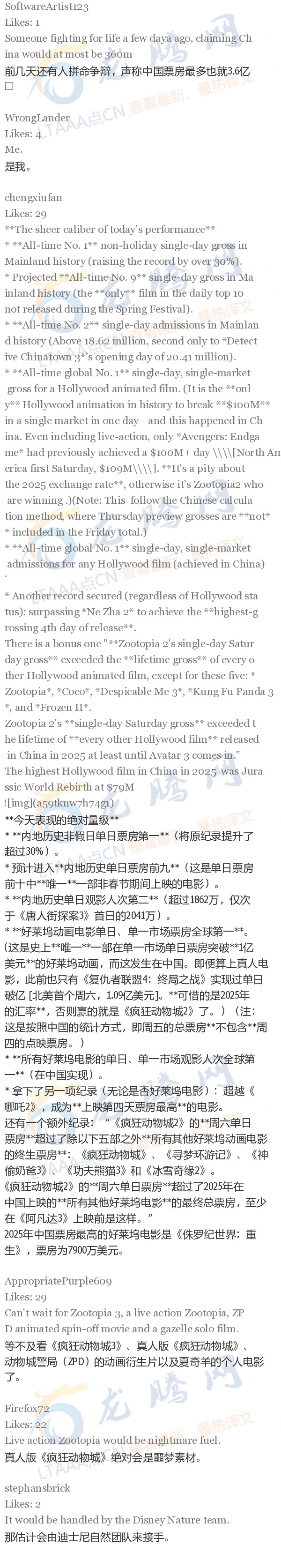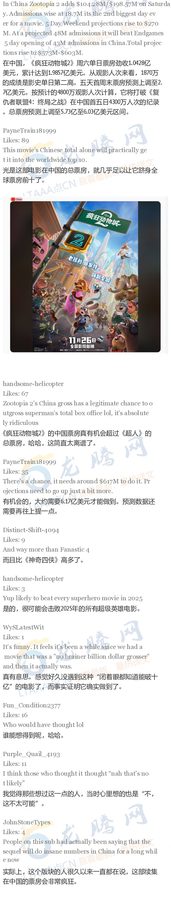 共5张【龙腾网】在中国,《疯狂动物城2》周六单日票房劲收1.0428亿美元,累计达到1.9857亿美元