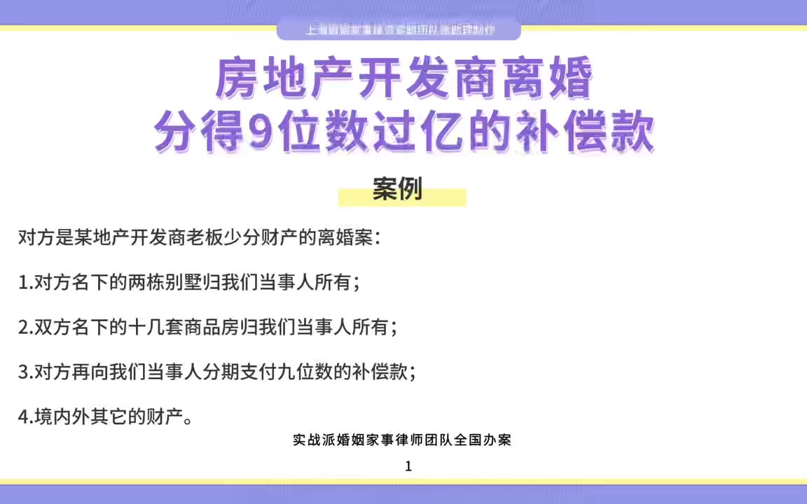 0次播放 | 00:12上海婚姻家事律师梁聪律师团队原创:房地产开发商离婚,分得9位数过亿的补偿款