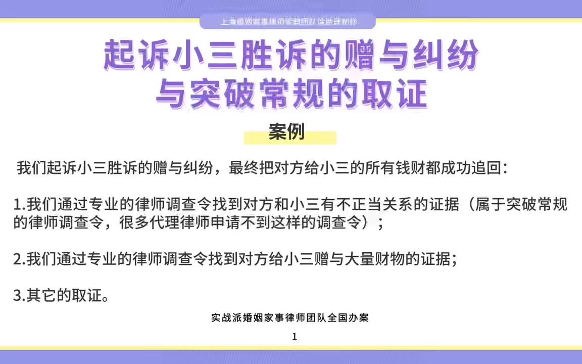 0次播放 | 00:12上海婚姻家事律师梁聪律师团队原创:起诉小三胜诉的赠与纠纷与突破常规的取证