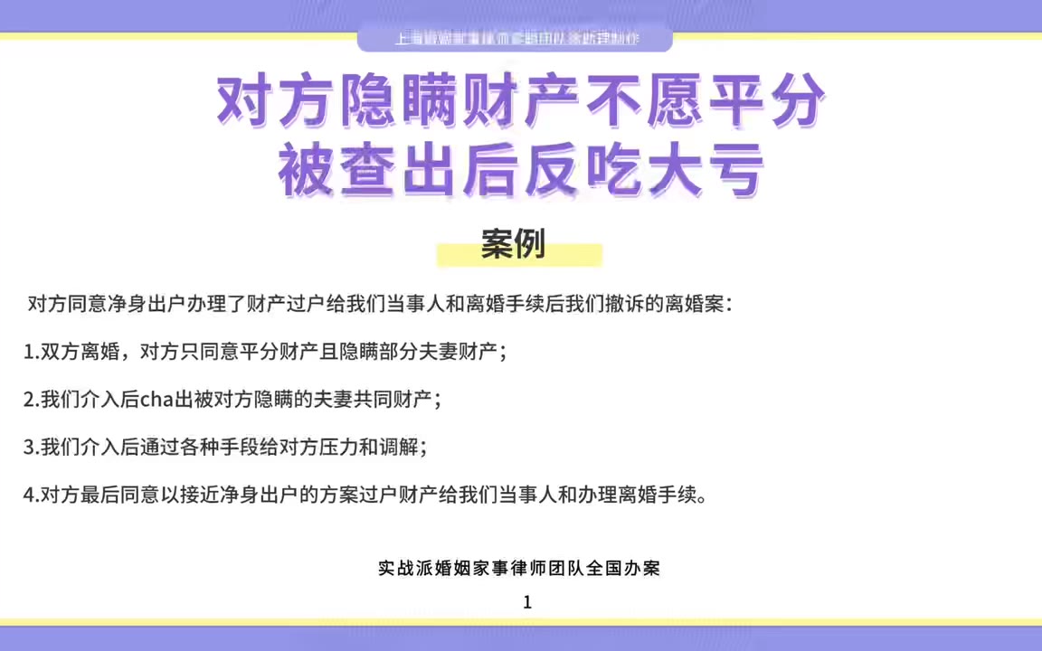 0次播放 | 00:13上海离婚律师梁聪律师团队原创:对方隐瞒财产不愿平分,被查出后反而吃大亏