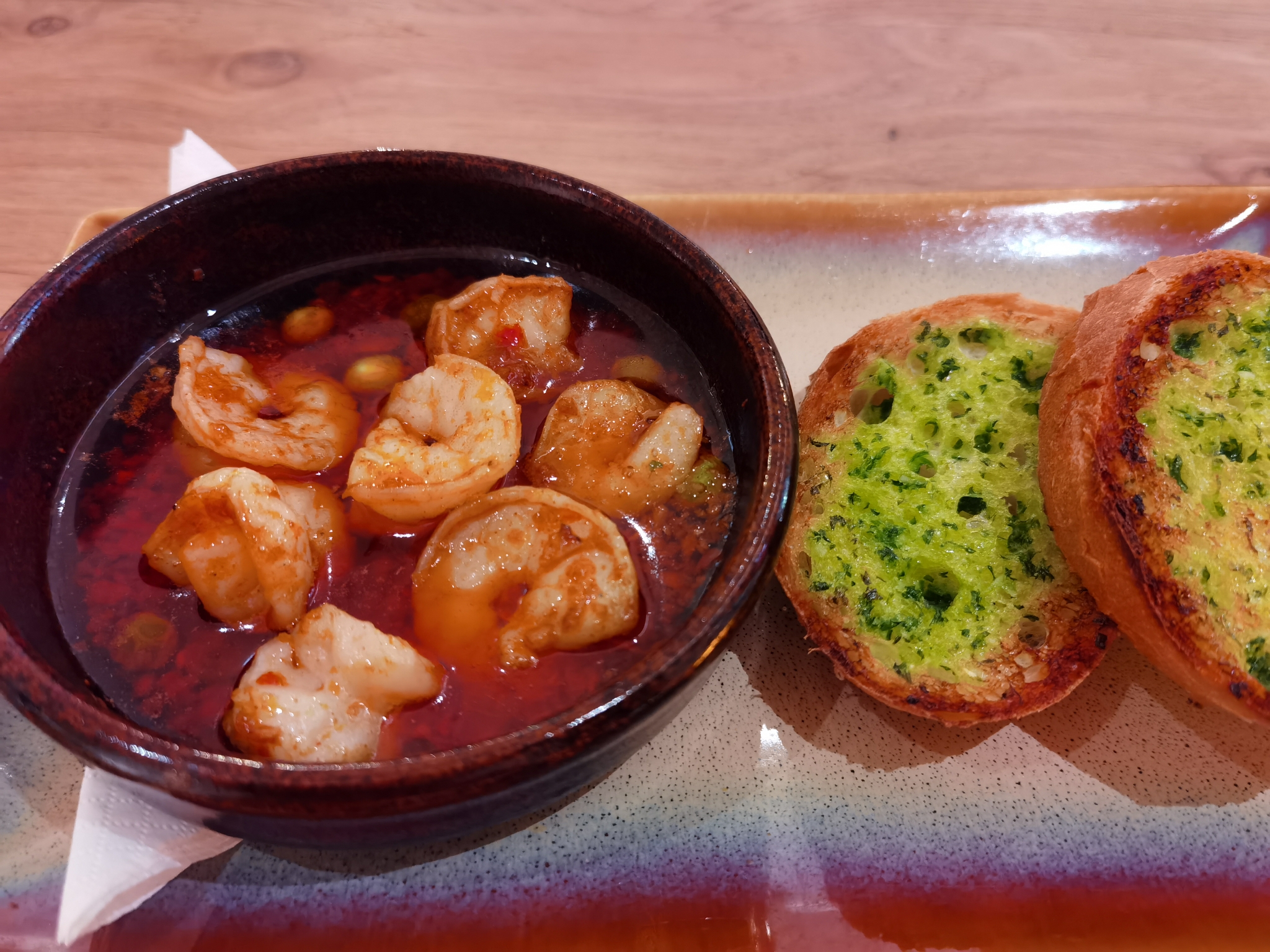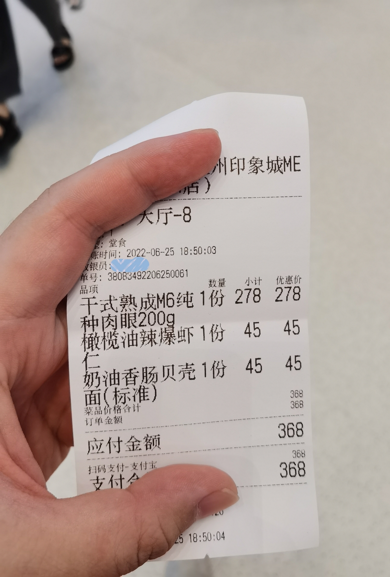 依旧是在印象城因为说这家有熟成牛排,于是决定来试试纯白装修,有点地中海风格虾仁脆嫩,口感很好,橄榄油味道不鲜明,被辣味掩盖,辣度不重两片烤面包,应该是抹了青酱,还是有点淡意面有蘑菇和牛肉,不多,下面还