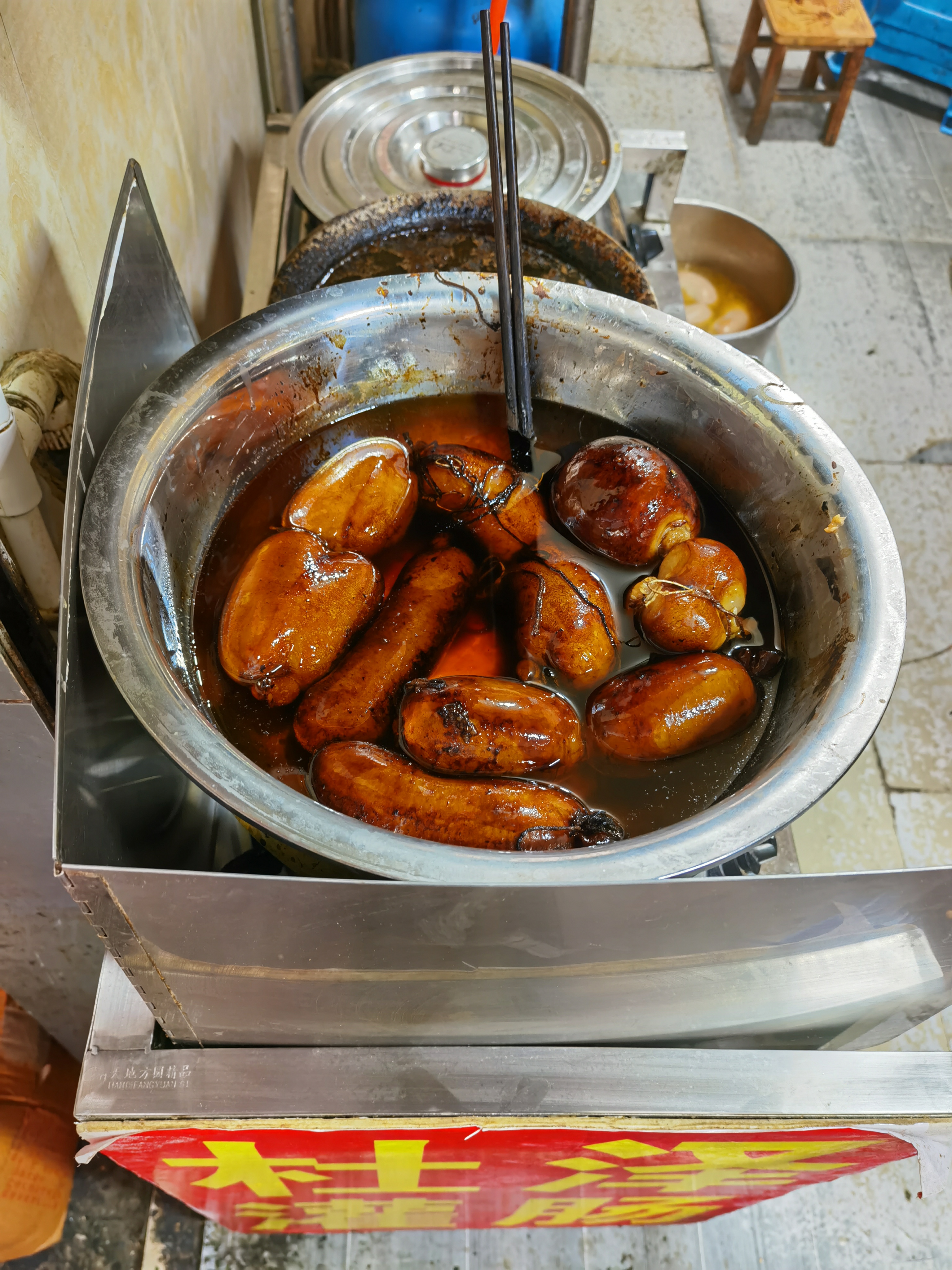 起早去了松园菜场因为隔壁还是花鸟市场,导致菜场的人尤其多,早上六七点,热烈的人间烟火沸反盈天。自从盗月社来过之后,几家出名的早点店,排队的人群基本没散过。杜泽灌肠,称斤卖的,猪大肠醸米粉或者糯米,带辣