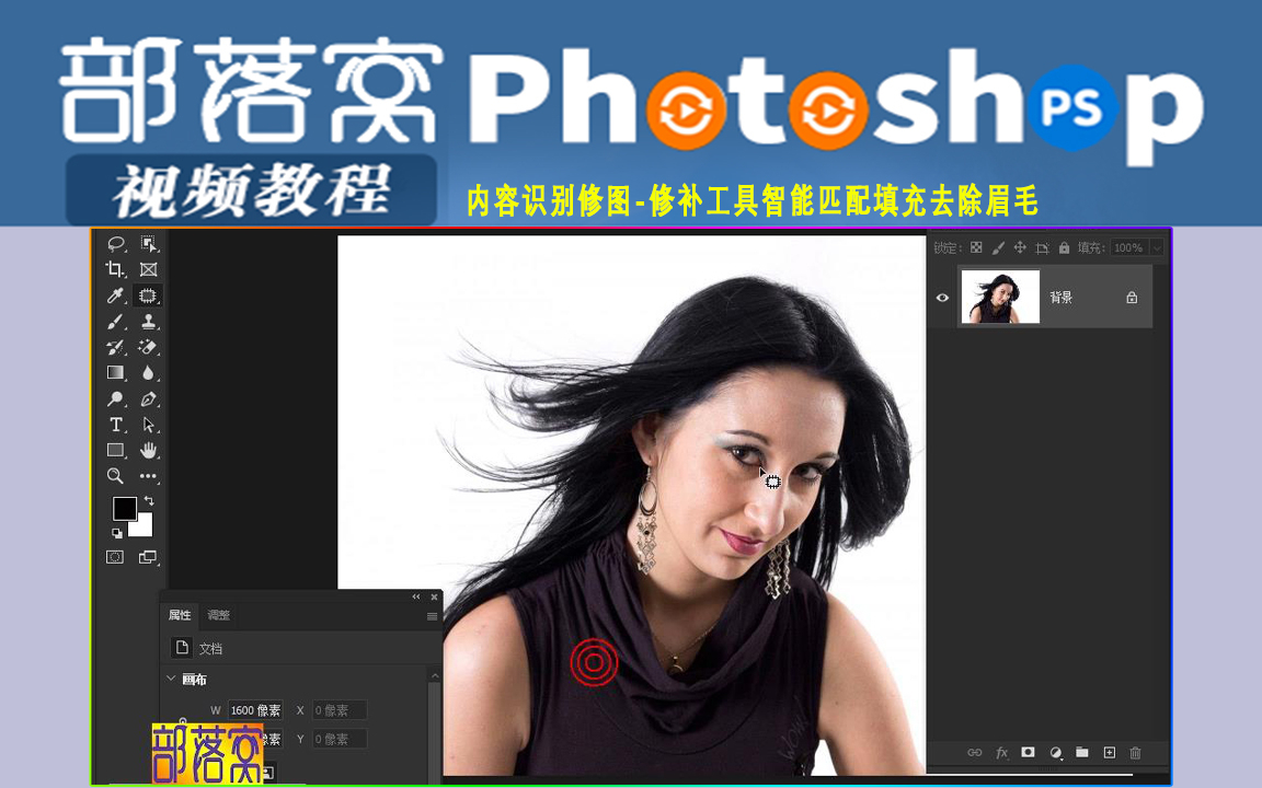ps内容识别修图视频:修补工具智能匹配填充去除眉毛