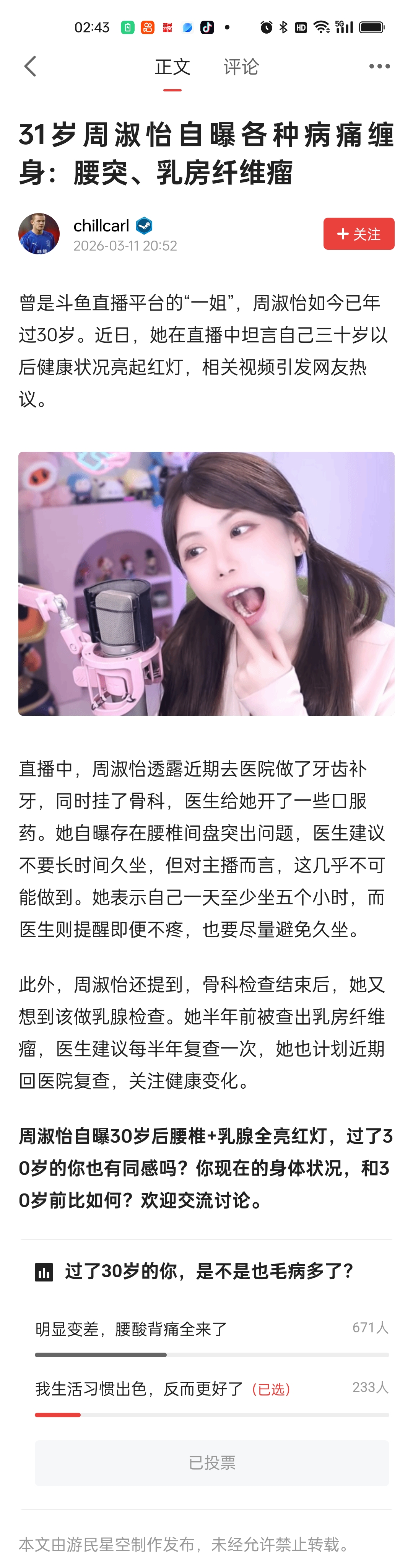 31岁周淑怡自曝各种病痛缠身:腰突、乳房纤维瘤