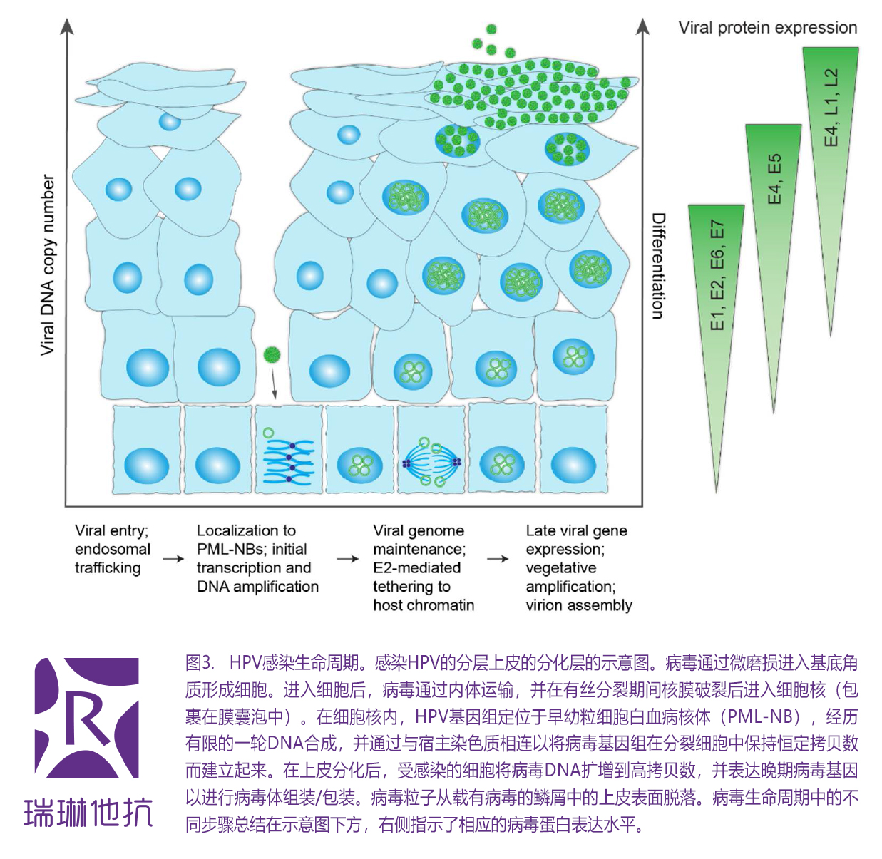 约5%的人类癌症是由致癌人乳头瘤病毒(HPV)类型的持续感染引起的。HPV感染周期可以在分层上皮中维持长期感染,因为病毒DNA在病变的分裂基底细胞中以低拷贝数染色体外质粒的形式维持,而后代病毒基因组在