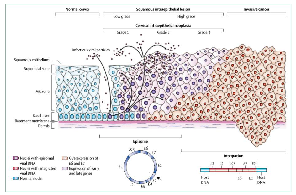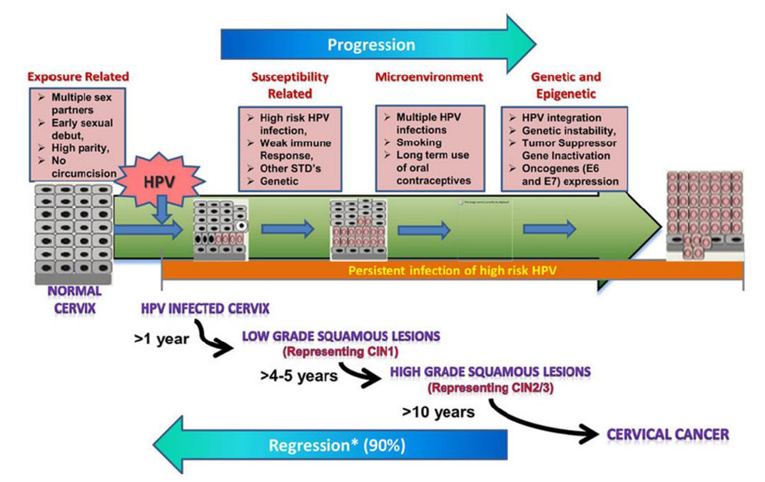 HPV是一种性传播病毒,在99.7%的宫颈癌标本中发现了高危HPV DNA。在接触病毒的12到24个月内,90% 的HPV感染消失或变得不活跃。 然而,高危型HPV病毒株的感染持续存在,这会增加进展为