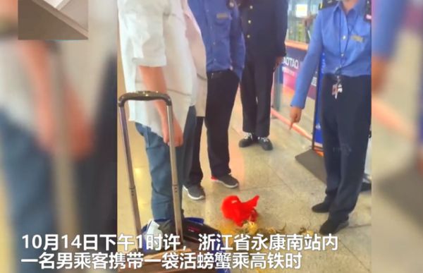 10月14日下午,浙江永康南站,乘客携带数只活螃蟹试图乘坐高铁,在进行安检途中被工作人员制止,告知乘客乘坐高铁不允许携带鲜活农产品,乘客无奈之下用脚将螃蟹全部踩死。网友曝光现场视频后引发热议。被拒后当