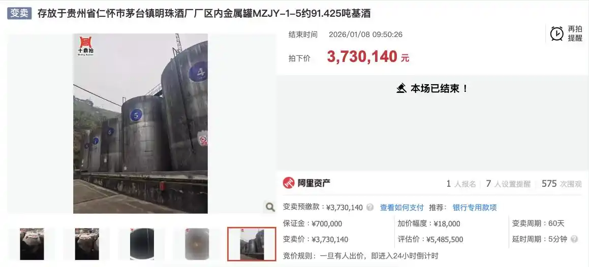 红星新闻红星资本局1月11日消息,近日,贵州省仁怀市茅台镇明珠酒厂厂区内存放的约91.425吨基酒,上架阿里司法拍卖平台进行拍卖,评估价约548万元,起拍价约373万元。只有一人报名,最终以底价竞得,