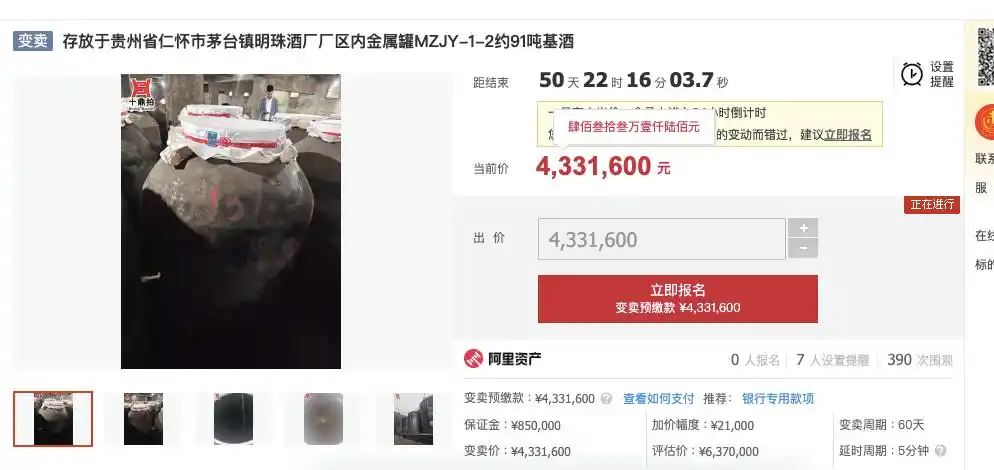 茅台镇一酒厂91吨基酒拍卖,仅1人报名,评估价548万,以373万元成交
