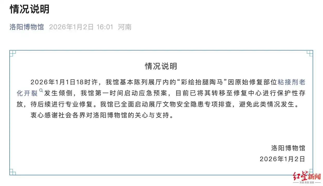 红星新闻1月2日,洛阳博物馆发布情况说明。2026年1月1日18时许,我馆基本陈列展厅内的“彩绘抬腿陶马”因原始修复部位粘接剂老化开裂发生倾倒,我馆第一时间启动应急预案,目前已将其转移至修复中心进行保
