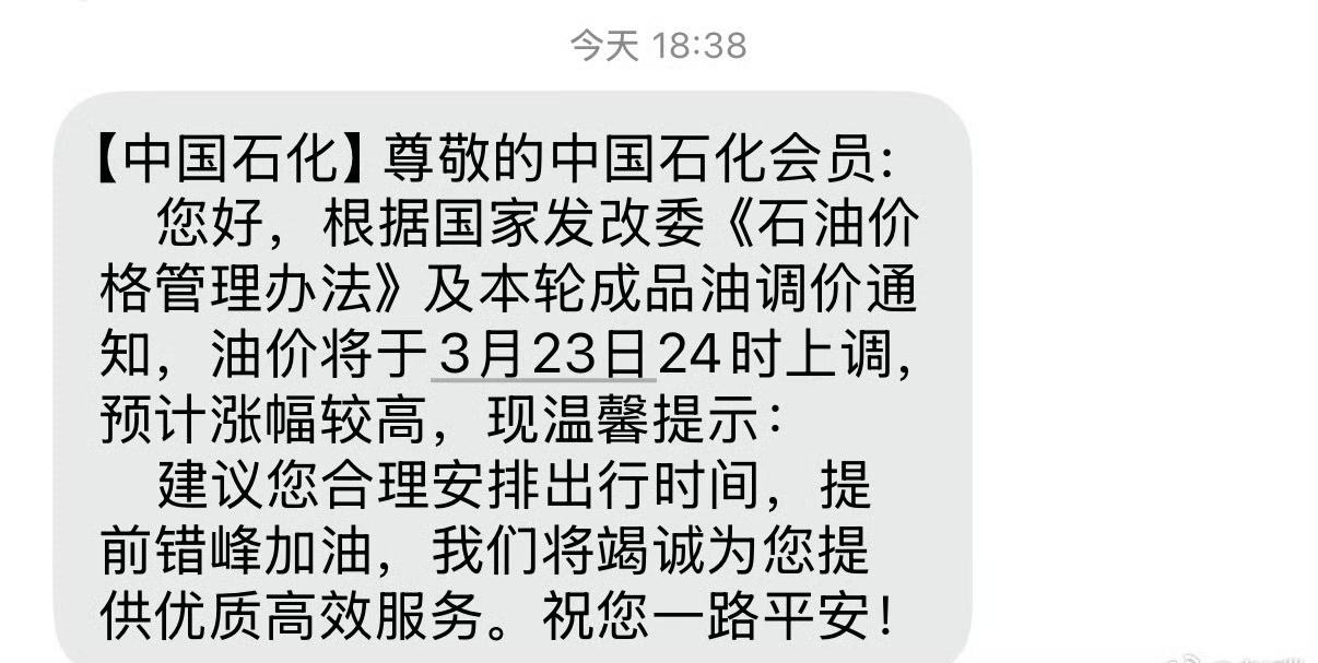 好家伙,油价要大幅上涨,中国石化都发短信提醒了!之前好像从来没遇到过 #中国石化提示提前错峰加油#