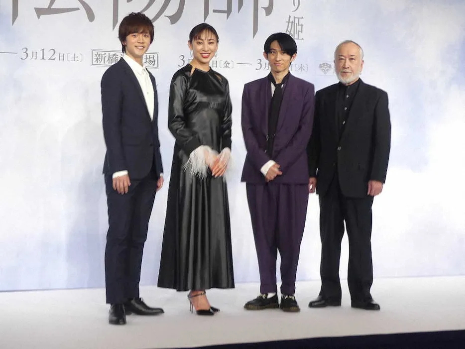 ▲出席了舞台剧《阴阳师 生成姬》制作发表会的(左起)林翔太、音月桂、三宅健、木场胜己(摄影:糸贺日向子))原V6成员三宅健(42岁)于13日出席了在东京都内举行的主演舞台剧《阴阳师 生成姬》制作发表会