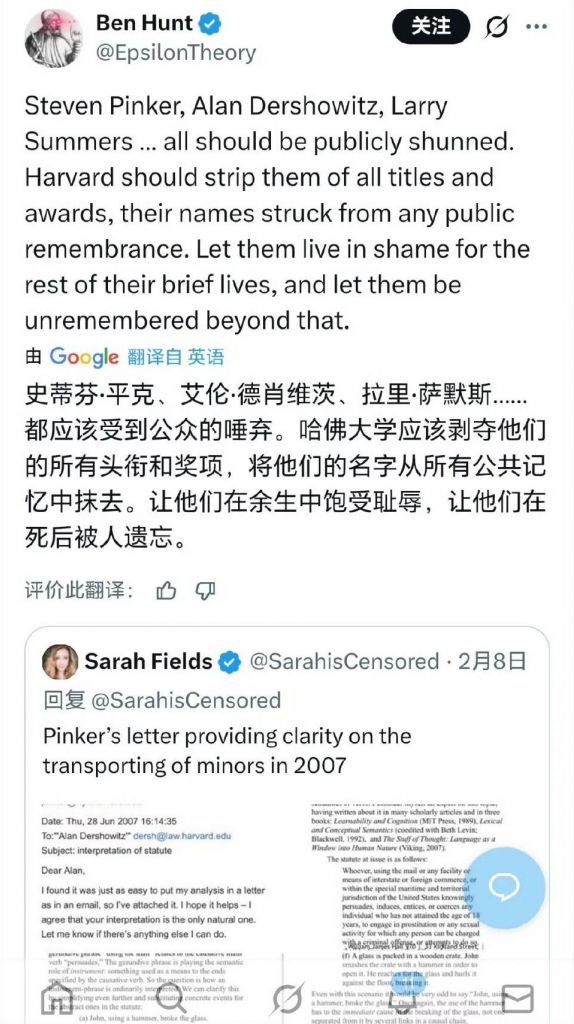 美国网友扒出,美国法律泰斗,哈佛大学教授德肖维茨在认识爱泼斯坦后,多次发文要求降低性同意年龄