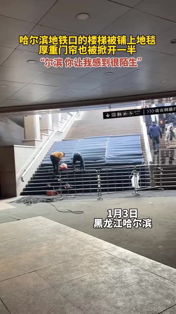 哈尔滨地铁口楼梯被铺上地毯,中央大街位置进入室内的厚重门帘也被掀开一半固定好,“尔滨,你让我感...