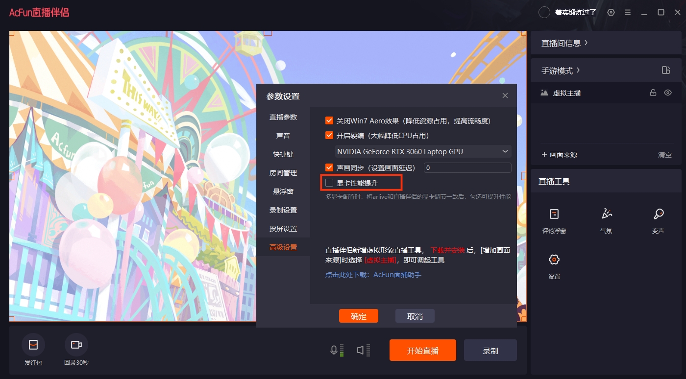 自己遇到问题:在已经配置好面捕助手后,点击画面来源,选择虚拟主播,直播不显示虚拟主播画面后来发现去掉下图里,显卡性能提升选项就好了